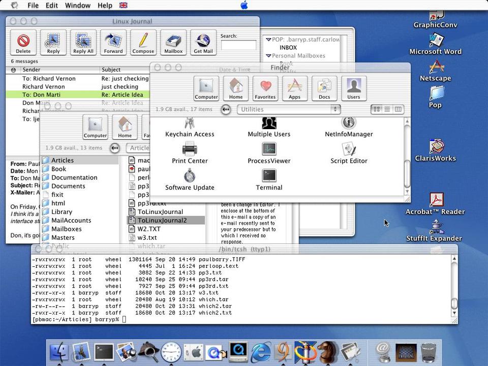 So, does Mac OS X mean the end of LinuxPPC on my office computer? For now, my problems with ispell not withstanding, the answer is “yes”. Mac OS X gives me all I need in the office; it's a Mac and it's UNIX/Linux, too. I'm in heaven. At home, I'm stuck with my Windows/Mandrake combo for now, but at least I can boot into Mandrake when my frustration meter for Windows 98 peaks. And, all the tools I use on Mandrake are, as they were with LinuxPPC, 100% compatible with those I now use on Mac OS X. Of course, the ability to avoid all those reboots in the office is a major plus for me.