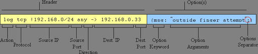 Snort rules consist of two logical parts: the rule header and options. Snort rules must be specified on a single line. Additionally, Snort rules must contain IP addresses, as a hostname lookup is not performed. Figure 2 shows the Snort rule header and options details.