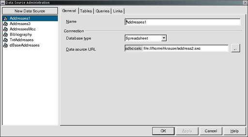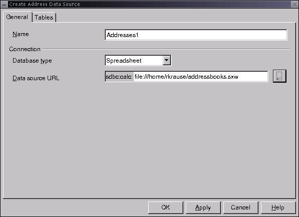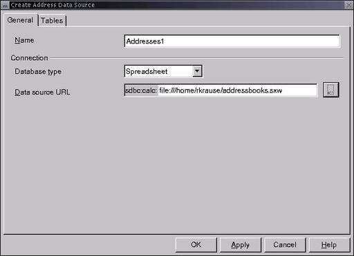 Select Spreadsheet in the database type dropdown box, and enter the spreadsheet filename in the Data Source URL field. Click OK to close the Create Address Data Source window.