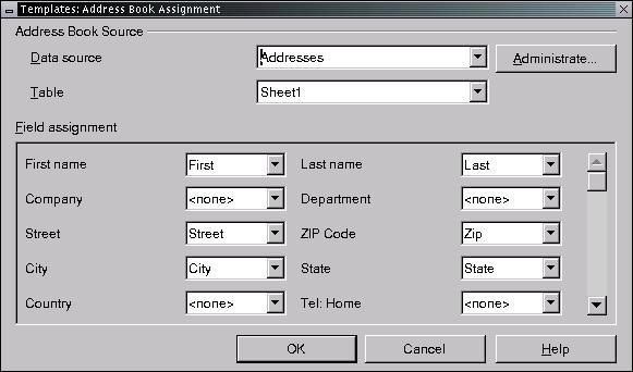 Next, map the spreadsheet columns to OpenOffice.org's address fields. This is accomplished by clicking on the Field Assignment button, selecting the appropriate spreadsheet column header for each address field and then clicking OK (see Figure 4).