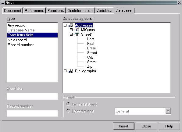 A form letter is a document containing fields populated by information from an address book. There are two ways to insert these fields into a document. One way is to position the cursor where you want the field and then click Insert -> Fields -> Other (keyboard shortcut Ctrl-F2). Click on the Database tab and select Form letter field in the Type list. In the Database Selection window pick the address book and field to insert, and then click the Insert button (see Figure 5). This will put a placeholder in your document where information from the address book will be inserted. Once you have inserted the fields that you need, click Close and continue editing your document.
