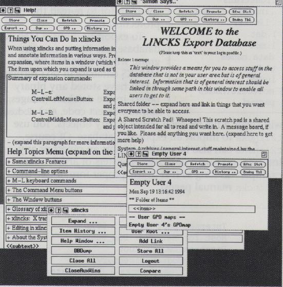 The current main user interface, xlincks, is an X11 application that allows you to edit and browse a LINCKS database in a hypertext fashion, using Emacs-like commands. xlincks provides a basic environment for document editing in a work-group setting, but provides only limited mark-up facilities at this time. The hypertext nature of LINCKS, together with the advanced view support, allows easy sharing of information and re-use of parts of documents (section, subsection, or paragraph) simply by creating links to the parts to be used.