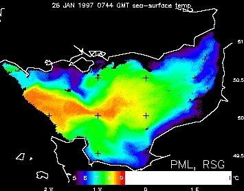 To study the atmospheric effects and the skin effect on measuring SST from space, I use marine infrared radiometers to measure SST at the same time as the satellites pass overhead, thereby getting simultaneous SST measurements. The ship I use is a ferry vessel, the MV Val de Loire (Figure 1) which sails regularly across the English Channel. Figure 2 shows a thermal infrared satellite image of the English Channel for January 1997 at which time the MV Val de Loire was approaching the French coast. The ship's radiometer and meteorological data are currently being used to evaluate the effect of the cool ocean skin on remotely sensed SST under a wide range of environmental conditions.