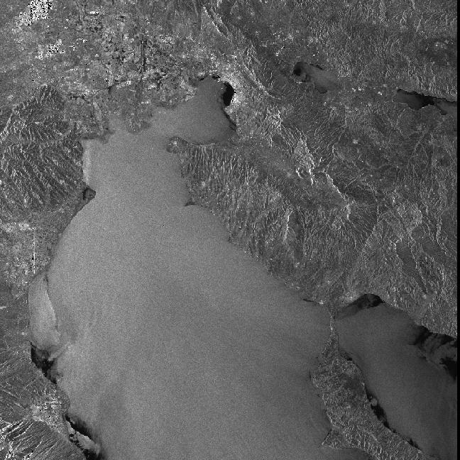 The scene in Figure 4 is a good SAR image of the Gulf of Thermaikos in the Aegean Sea, just off the coast of Greece. The image was taken by the ERS-2 SAR on 25 May 1996 at 20:43 GMT. A number of oceanographic features evident in this image which are of general interest. The numerous black swirls and bands across the water surface correspond to surface slicks. Much of the slick material comes from a river outflow at the edge of the city of Thessaloniki, seen at the top left in the image. This reverine material is concentrated around the top of the bay and is then distributed throughout the gulf by eddies, tides and wind-driven currents. Incidently, the dark square patches around the town are probably rice fields which give very little radar return signal. In the bottom right of the image is the edge of Mount Olympus, mythical home of the Greek gods.