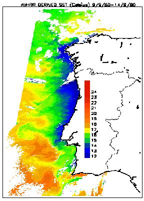 Figure 6 shows an interesting image from the Coastal Zone Colour Scanner (CZCS) which is an instrument which flew on the Nimbus 7 satellite. The instrument is no longer functional but worked well between 1978 and 1985. The image data were acquired on 14/9/80 and show the Western coast of the Iberian Peninsula. The image shows pigment concentration during a strong upwelling event. (Equatorward winds push the water away from the coast, and cool water from beneath the surface is drawn upwards near the coast.) The pigments are produced by phytoplankton.