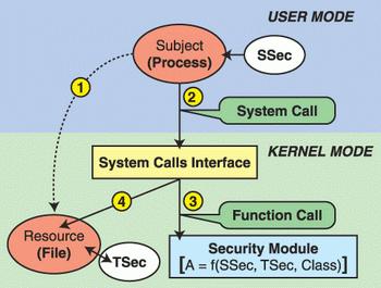 Let's assume that the subject (a process in this case) has a security ID of SSec and is trying to access (1) the resource (a file in this case) having the security ID TSec. To perform the access, the subject issues the system call (2). The system call is handled by the Linux kernel code (the system call interface in Figure 1). Before the access decision is taken, the kernel consults (using security hooks) the LSM module (3), where the user-specific security is implemented as a function “f”. LSM will compute the function “f” and return the results to the kernel. The kernel will then either grant or deny access to the target resource (4).