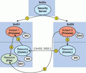 In Figure 3, we illustrate an example of how the distributed access control works. The security server is responsible for passing the security policy to the security module. It is also responsible for providing the security node ID to each node of the cluster (1). Let's assume the subject2 in node SnID2 tries to access a resource (file) on the node SnID1 (2). In this case subject2 first must get access to the local communication resources (3) and then get a pair of identifiers (SnID2, SID2) that then must be passed to the remote node (4). Those identifiers will be validated on the remote node SnID1. When the access is granted, the message can be passed to process 1 (5). Now process 1 will perform an access on behalf of process 2 (6).
