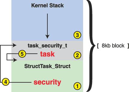 Since Linux stores the process descriptor and the kernel mode process stack in a single 8KB memory area, we can use this fact and avoid allocating memory for labeling the subjects (Figure 5).