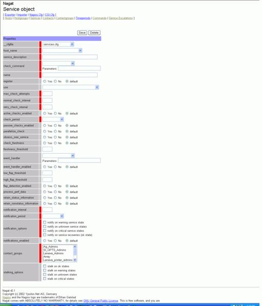 Because we used Nagat, we ran into some difficulties with our Red Hat 8 install. To fix the compatibility problems, we had to install earlier versions of PHP (4.1.2) and Apache (1.3). With this resolved, we were able to get the systems up and running quite quickly. Nagat had a few bugs that were easy to work out, one occurring on the service edit page: the system does not save the contact group. To fix this, all you have to do is add the following lines after the case statement on line 39: