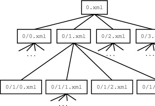 Re-examining indexing methods based on these constraints yielded an interesting solution: B-trees and hashes are the two most commonly used indexing methods. I chose to use B-trees due to the fact that a filesystem organizes files in a tree; this could be used to store the structure of the B-tree, saving some precious space in the process. Second, the key/link pairs could be analyzed, and a balanced B-tree could be created. The structure of the XML files themselves was kept as minimal as possible, so single-letter tags were used as a space-saving move.