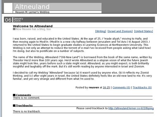 Moreover, some of the nicer Weblog features, such as comments and trackback, can be tricky to implement. They aren't necessarily hard to work with, per se, but given that it seems 100,000 different mechanisms for commenting on Weblog postings already are out there, I would like to avoid creating number 100,001.