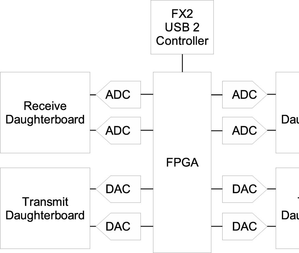 The preferred solution is the Universal Software Radio Peripheral (USRP). Figure 2 shows the block diagram of the USRP. The brainchild of Matt Ettus, the USRP is an extremely flexible USB device that connects your PC to the RF world. The USRP consists of a small motherboard containing up to four 12-bit 64M sample/sec ADCs, four 14-bit, 128M sample/sec DACs, a million gate-field programmable gate array (FPGA) and a programmable USB 2.0 controller. Each fully populated USRP motherboard supports four daughterboards, two for receive and two for transmit. RF front ends are implemented on the daughterboards. A variety of daughterboards is available to handle different frequency bands. For amateur radio use, low-power daughterboards are available that receive and transmit in the 440MHz band and the 1.24GHz band. A receive-only daughterboard based on a cable modem tuner is available that covers the range from 50MHz to 800MHz. Daughterboards are designed to be easy to prototype by hand in order to facilitate experimentation.
