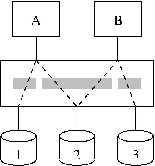 The advent of FibreChannel (FC) in the mid-to-late 1990s improved this situation considerably. Although compatibility was and to some extent still is a problem, the multi-kilometer FC lengths greatly simplified datacenter layout. In addition, most of the FC-connected RAID arrays export logical units (LUNs) that can, for example, be striped or mirrored across the underlying physical disks, simplifying storage administration. Furthermore, FC RAID arrays provide LUN masking and FC switches provide zoning, both of which allow controlled disk sharing. Figure 1 illustrates an example in which server A is permitted to access disks 1 and 2 and server B is permitted to access disks 2 and 3. Disks 1 and 3 are private, while disk 2 is shared, with the zones indicated by the grey rectangles.