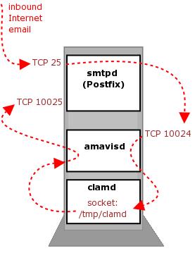Figure 2. Postfix, Amavisd-new and ClamAV Data Flows