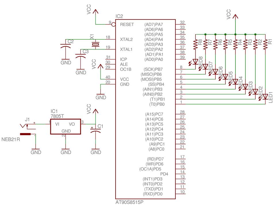 For those using the STK500 development kit, simply connect PORTB to the eight onboard LEDs using the ten-wire cable (as illustrated in Figure 3), and watch das blinkenlights. You can set up your own test hardware by constructing the schematic shown in Figure 4, which connects LEDs with suitable limiting resistors such that each pin of PORTB can activate one by going low and sinking current.