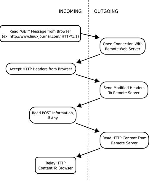 Operations you'd otherwise do with one or two methods tend to require several callback methods in event-driven programming. The rule of thumb is, any time there's a blocking operation you need to wait on, it happens outside your code and, therefore, between two of your methods. In the case of our proxy server, we can break down into separate chunks each part of handling a request. Most of what a proxy server does amounts to reading in data from a browser, making a few changes to that data and sending the modified data to the remote Web server. As of HTTP/1.1, multiple Web hits can be handled over one network connection. In Figure 2, you can see what happens to each request, keeping in mind that multiple requests can be made per HTTP connection. Arrows connecting boxes show which events are spawned and in what order.