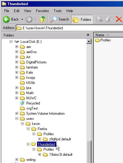 To make all of your stored e-mail accessible from both your Windows and Linux installations, the configuration folder must be moved to the shared partition. I made a directory \users\kevin\Thunderbird on my shared partition and copied the Profiles directory from the default Windows location into the new shared directory. In my case, the view from Windows Explorer looks like Figure 3.