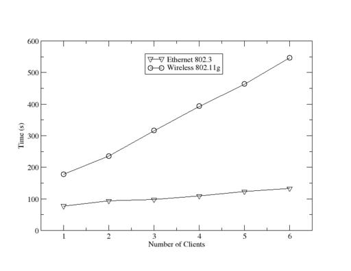 We tested the thin-client network extensively in three different scenarios: first, when multiple clients are booting simultaneously over the network; second, booting a single thin client over the network at varying distances, which are simulated by altering the attenuation introduced by the chamber; and third, booting a single client when there is heavy background network traffic between the server and the other clients on the network.