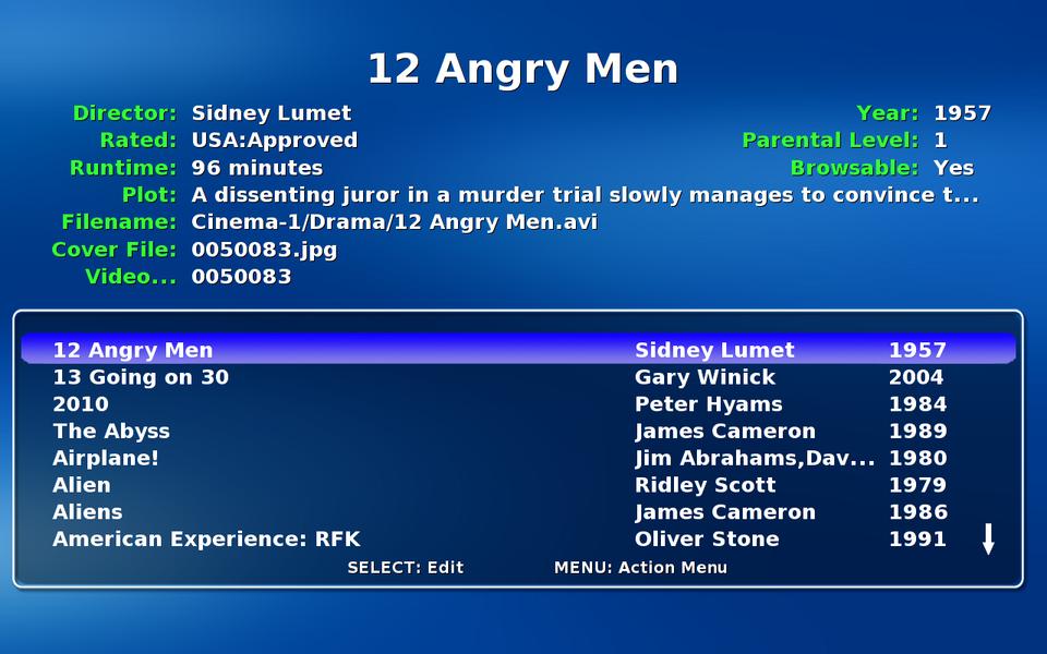To update the database, choose Videos→Video Manager. This takes you to a page where you can select a video to edit. Your collection is listed alphabetically by video title with the director and year also listed. New additions to the MythVideo storage directories show up with the filename, followed by Unknown for the director and a question mark for the year.