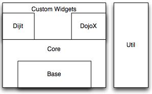 So that you better understand exactly where gfx fits into the larger toolkit, recall that Dojo breaks down into roughly five components: Base, Core, Dijit, DojoX and Util. Base is the tiny dojo.js file that contains hard-live-without library code for common operations; Core includes most of the programmatic machinery for the toolkit; Dijit is an assortment of turnkey widgets; DojoX provides a collection of specialized subprojects; and Util provides a testing framework and scripts for tasks, such as minifying and consolidating JavaScript and CSS files. The gfx library is one of those many specialized subprojects that lives under the DojoX umbrella.