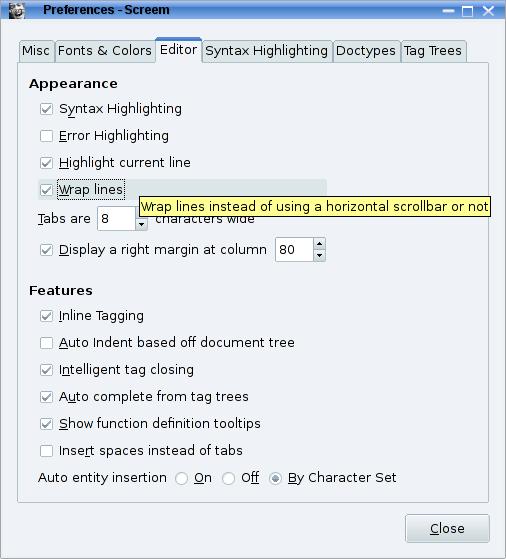 Before you get going on that first Web site, I am going to direct you to the Preferences dialog for a quick change of one of the default settings. Click Edit, then select Preferences. A six-tabbed window appears from which you can modify the default operation of much of the Screem's interface and features. There is one setting that I recommend you change right away and that's word wrap. Click the Editor tab and look for the check box labeled Wrap lines (Figure 7). Make sure it's checked on, and then click the Close button.