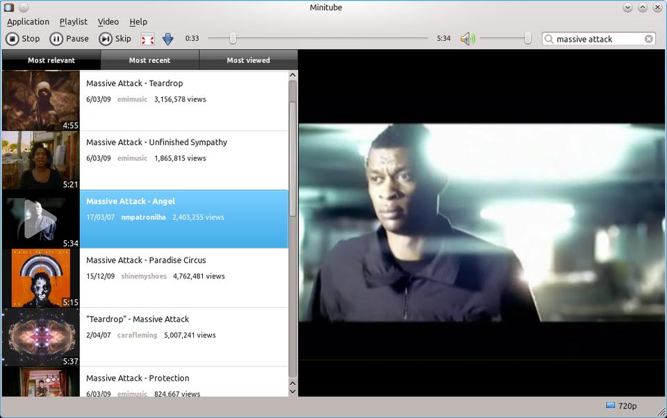 Exploring the program further, you can edit the playlist on the left by clicking and dragging videos up and down. You also can refine searches by using the three tabs: Most relevant, Most recent and Most viewed. Thankfully, the controls everyone takes for granted also are included, such as a sliding volume control, stop, pause, skip and the all-important seeking bar.