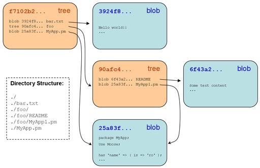 In the example shown in Figure 1, I'm assuming that the files MyApp.pm and MyApp1.pm have the same contents, and so by definition, they must reference the same blob object. This behavior is implicit in Git because of its content-addressable design and works equally well for directories with the same content.