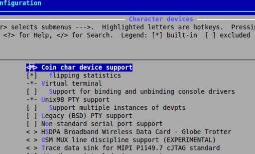 the command-line utility scripts/kconfig/mconf will start and read all the Kconfig files to build a menu-based interface. You then use these programs to update the values of your COIN and COIN_STAT compilation options. Figure 1 shows how the menu looks when you navigate to Device Drivers→Character devices; see how the options for the coin driver can be set.