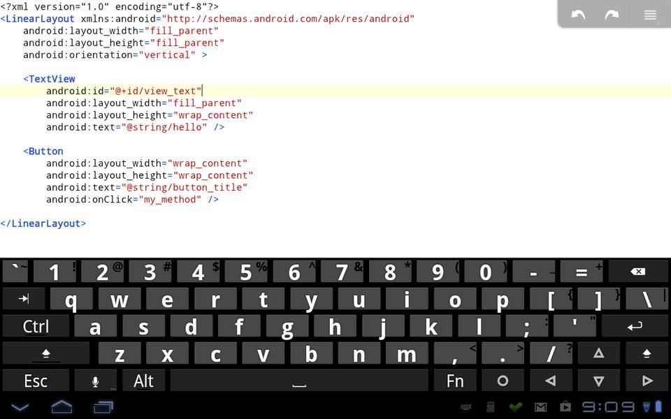 To this example, let's add a button to change the text being displayed. If you need to do any amount of typing, you will want to download and install a more complete soft keyboard or use an external Bluetooth keyboard. A good soft keyboard is the hacker's keyboard. It includes a lot of extra keys that are useful in code editing, including arrow keys to aid navigation and real control, Tab and Escape keys. Most soft keyboards included on Android devices lack these.