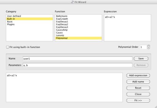 Once you have had a chance to look at your data, you may have started to form an idea of a model that represents the system you were measuring. An idea is not enough, however. You actually need to do some calculations and see whether your model fits the data you collected. Two options are available. The first is to use the Fit Wizard. You can access it by clicking on the menu item Analysis→Fit Wizard. This pops up a window where you can build a function describing your model. Once you have built up your model, click the button called Fit. This pops up a new window where you can select the details of doing the actual fitting of the generic function to your data. Here you can set the initial guesses and select the algorithm used to do the actual fitting (Figure 6).