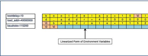 Typically, vendors flash an environment data image to external storage present on your board. The format of this pre-built environment is again the same—that is, a linearized list of strings, but there is a 4-byte CRC header prefixed to it. This CRC is computed over the environment data. Figure 2b illustrates such an environment blob with CRC data, followed by valid environment data and an invalid one after that. The total size of this environment data is fixed to CONFIG_ENV_SIZE during compilation. So, if your environment usage exceeds this size, you would need to recompile your U-Boot binary after increasing CONFIG_ENV_SIZE. If you do not increase the size, U-Boot will refuse to save the environment variables.
