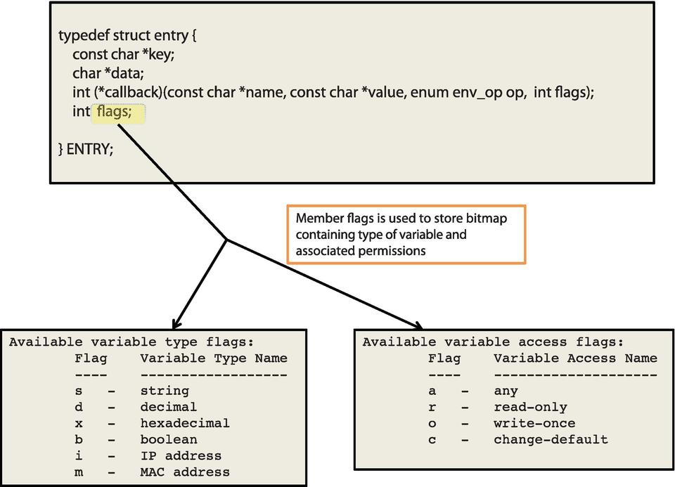 Each environment variable entry inside the hashtable is represented by a data structure called a struct entry (Figure 5). Apart from the members key and data, which correspond to “name” and “value” in the linearized representation of data, you have members called callback and flags. flags is of integer type and is used to implement type check and access control. callbacks is the callback function associated with this environment variable. If defined, this callback handler would be invoked whenever any operation (like add, delete or modify) is performed on this environment variable.