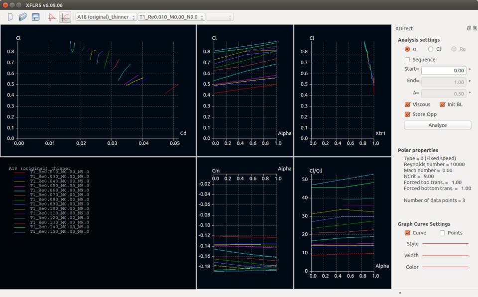 You also can select whether to do this for only the current foil, or you can do the analysis for a list of foils. Once you have all of the parameters set, you can click on the Analyze button at the bottom of the window. For each step, you will see an output message in the top right-hand pane telling you how many iterations were needed for convergence, and in the bottom left-hand pane, you will see the actual plotted values for each iteration of each step. Once it finishes, you can close this analysis window and go back to the main window. The polar view will be opened automatically, showing you all of the polar plots. You can select a single polar plot of interest by clicking on the menu item Polars→Polar Graphs, and then selecting the graph you want to see.