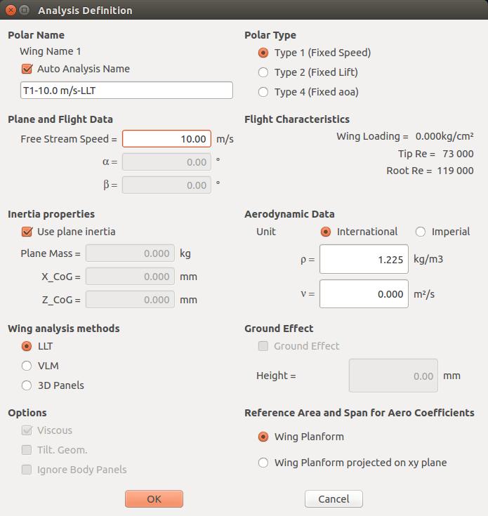 You now need to test your wing and analyze how it will behave when it starts moving through the air. Clicking on the menu item Analysis→Analysis Definition will bring up a parameter window where you can set up the details of your analysis.