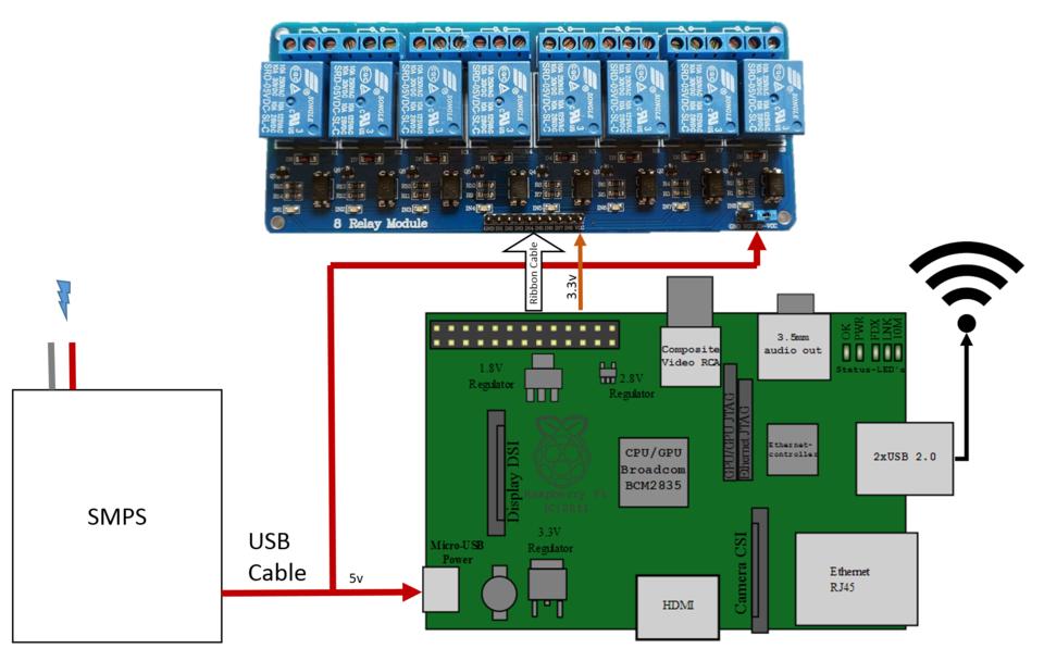 | Power supply | 1 | $8 | amazon.com (www.amazon.com/gp/product/B00HF3G7NO) | To power the RPi and the relay module |