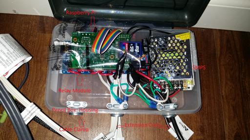 Cut the remaining extension cables at the plug end, and screw in the wire end to the relay. Also daisy-chain the live wire from the wall outlet to the relay terminals. The entire setup can be housed in a pencil box or something similar. Plan this out in advance to avoid having to unwire and rewire the terminals. Additionally, I added a few screw cable clamps to the holes I made in my housing to act as a strain relief (Figure 3).
