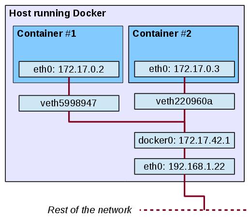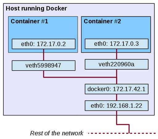 When Docker starts a container, by default, it creates a virtual interface on the host with a unique name, such as veth220960a, and an address within the same subnet. This new interface will be connected to the eth0 interface on the container itself. In order to allow connections, iptables rules are added, using a DOCKER-named chain. Network address translation (NAT) is used to forward traffic to external hosts, and the host machine must be set up to forward IP packets.