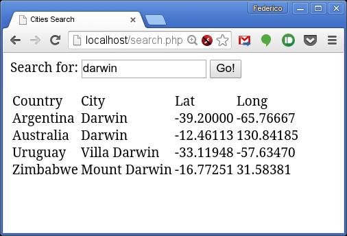 The search application search.php is simple (Listing 4). It draws a basic form with a single text box at the top, plus a “Go!” button to run a search. The results of the search are shown just below that in a table. The process is easy too—you access the database server to run a search and output a table with a row for each found city.