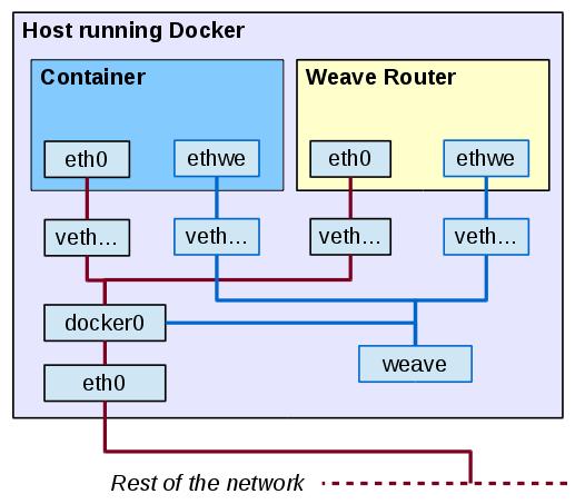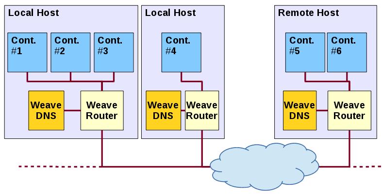 First, decide which (unused) subnet you'll use, and assign a different IP on it to each container. Then, you can weave run each container to launch it through Docker, setting up all needed network connections. However, here you'll hit a snag, which has to do with the missing step I mentioned earlier. How will containers on different hosts connect to each other? Docker's --link option works only within a host, and it won't work if you try to link to containers on other hosts. Of course, you might work with IPs, but maintenance for that setup would be a chore. The best solution is using DNS, and Weave already includes an appropriate package, WeaveDNS.