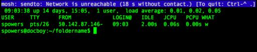 That's where Mosh comes into play. I was lamenting in IRC, and user “bkidwell” mentioned Mosh as being a great terminal client for questionable or often-changing connections. It uses a combination of TCP over port 22 and UDP on a higher port to provide a smooth, flexible terminal session regardless of your connection reliability or performance. Rather than waiting for the remote server to echo what you type, Mosh displays your local typing and edits in real time, then “catches up” with the server as quickly as it can. The coolest part, however, is that Mosh will keep your connection alive and running even if you change network addresses! Switching from McDonald's Wi-Fi to your phone's shared data? No need to log out and back in.