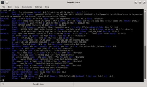 CPU~Quad core Intel Core2 Quad CPU Q8400 (-MCP-) ↪clocked at 2003.000 Mhz Kernel~4.1.5-1-desktop ↪x86_64 Up~2 days 23:24 Mem~2377.4/3949.4MB ↪HDD~3660.7GB(67.9% used) Procs~202 Client~Shell ↪inxi~1.7.24