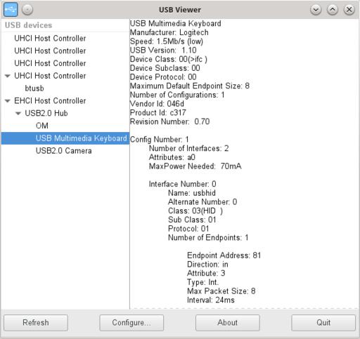 To start with, usbview is a rough graphic equivalent of lsusb or usb-devices, which I discussed earlier. It's quite simple to use, with no options or parameters. It shows two columns: the left one is a tree of all available USB devices, and the right one gives the full details. Figure 3 shows details on my USB keyboard.