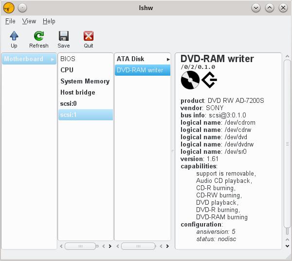 Let's move on to a command I already discussed, which shares the display style: lshw -X. Instead of producing a listing (as shown previously), the -X option produces a graphic interface with several columns on the left to let you choose what hardware to inspect. An area to the right shows the full hardware details for the chosen device. Figure 4 shows the result of analyzing my optical DVD reader/writer unit; the provided information includes other details, such as the logical unit name, its capabilities and more.