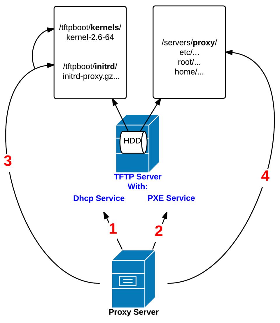 Figure 1. Here's an example of a proxy server with initrd as a real root filesystem. 1) Configure the proxy server BIOS to boot with PXE and configure the DHCP service to tell this server the IP of the TFTP server. 2) Configure the PXE service in the TFTP server to serve the kernel and initrd files to the proxy server. 3) The proxy server knows the IP of the TFTP server and asks it for the kernel and initrd files. 4) The proxy server boots and executes the /etc/rc script. This script mounts a directory of the TFTP server via SSHFS and copies the configuration files.
