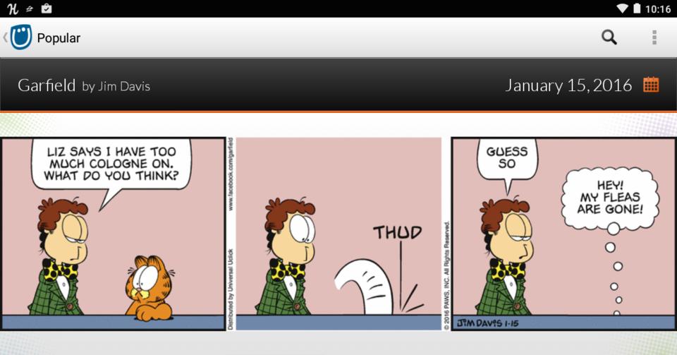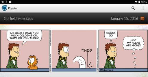 Whether you love them or hate them, the GoComics Web site is full of new and old comics alike (www.gocomics.com). The GoComics app for Android is a free way to consume those daily comic strips whether they're new or decades old. My personal favorite comic of all times is Garfield (shown in the screenshot). I collect Garfield memorabilia, Garfield books, and as a kid, I even had Garfield sheets and curtains in my room. Anyway, thanks to the GoComics app, I'm able to read decades of Garfield comics at my leisure, and see the latest strips as well.
