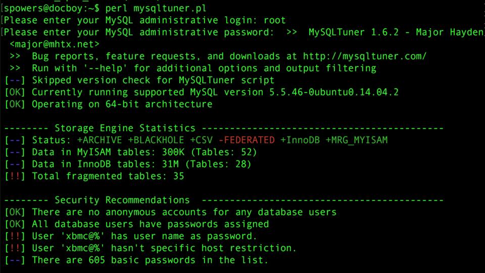 You can download your copy at mysqltuner.com. Be sure to read the documentation to get the most use out of the program. And, if you discover security problems like the ones shown in my screenshot? Fix them!