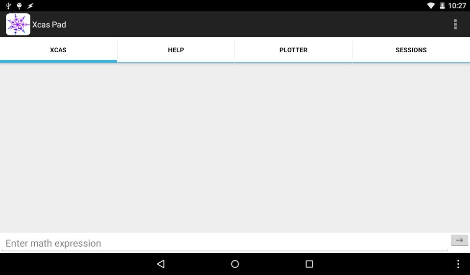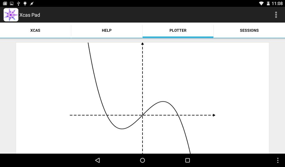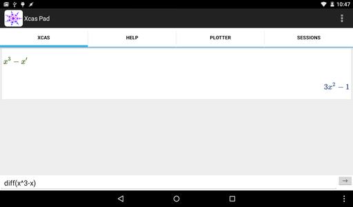 When you first start Xcas Pad, it asks you to enable the keyboard included with the application. It takes you to the Language and Input section of the settings so you can activate the keyboard. When you finish, click the back button and go back to Xcas Pad's main screen. The main screen has four tabs along the top where you can access the main worksheet, a help screen, a plotter screen and a session pane. At the bottom of the xcas pane is an entry line where you can enter the individual xcas commands. The output from each command is displayed in the main portion of the xcas pane. As an example, you can find the derivative of the equation x3–x with the command: