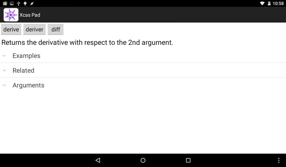 Xcas is a very large system, however, with many different commands. Part of the problem is trying to find exactly the command you need to use. Tapping on the Help tab at the top of the screen brings up the help pages available within Xcas Pad. At the top, you can enter a search string to narrow the list a bit. You can find a description of the above example command by searching for the string “diff”. Tapping the entry for “diff” pulls up a help page with a short description, a list of examples, related commands and the arguments for the command.