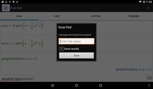 There is a check box where you can select whether you also want to save off the results along with the commands from your worksheet. You can reload these saved sessions from the session tab. When you click on it, it gives you a file and directory listing for the default “home” directory on your Android. Any sessions you saved from Xcas Pad will be in the xcaspad sub-directory. You also can copy over other xcas-saved files from work you may have done on your desktop.