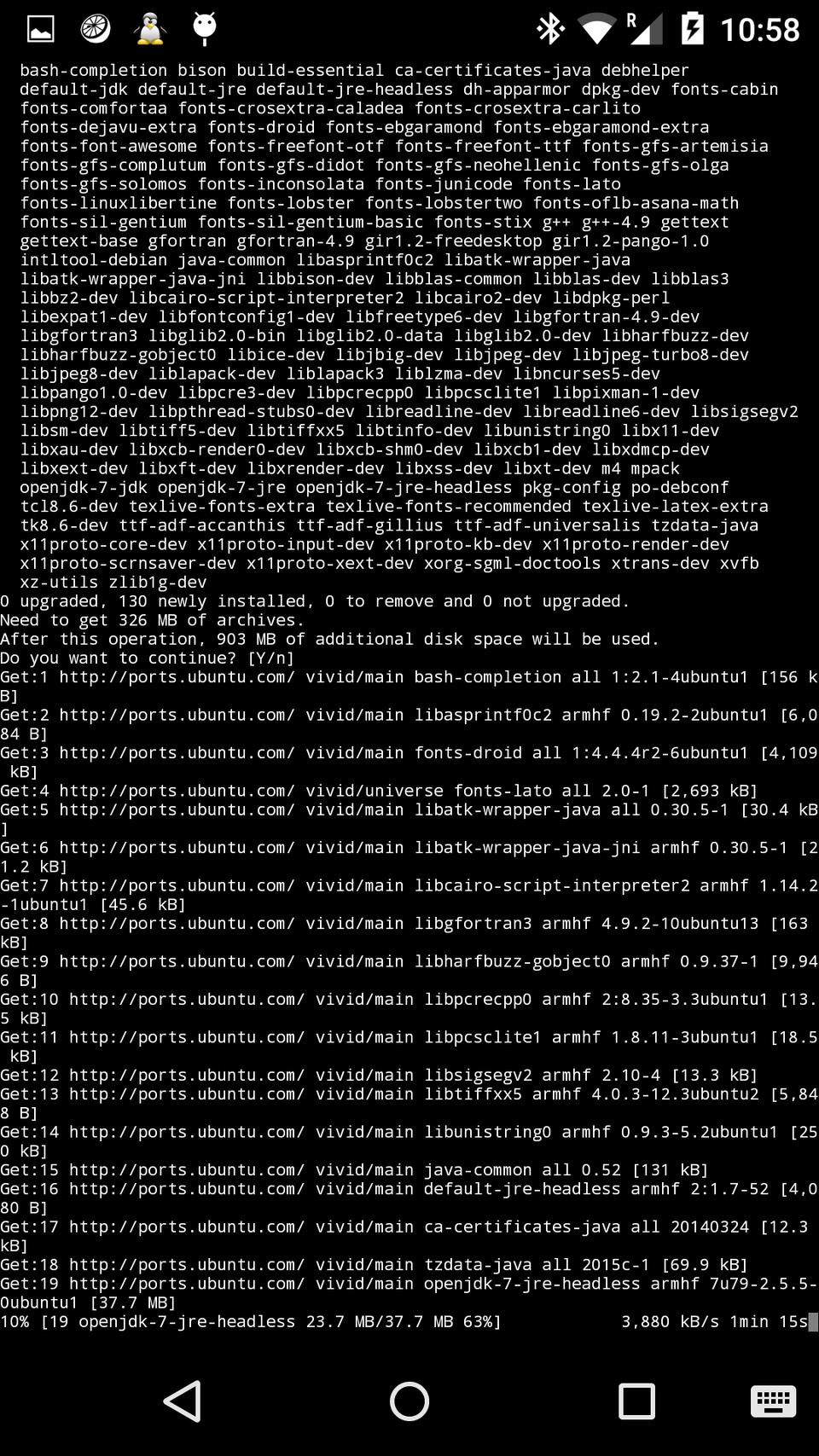 Next, install some basic Linux tools in the terminal via JuiceSSH (note: this may take several hours; see Figure 2 for a screenshot during the installation):